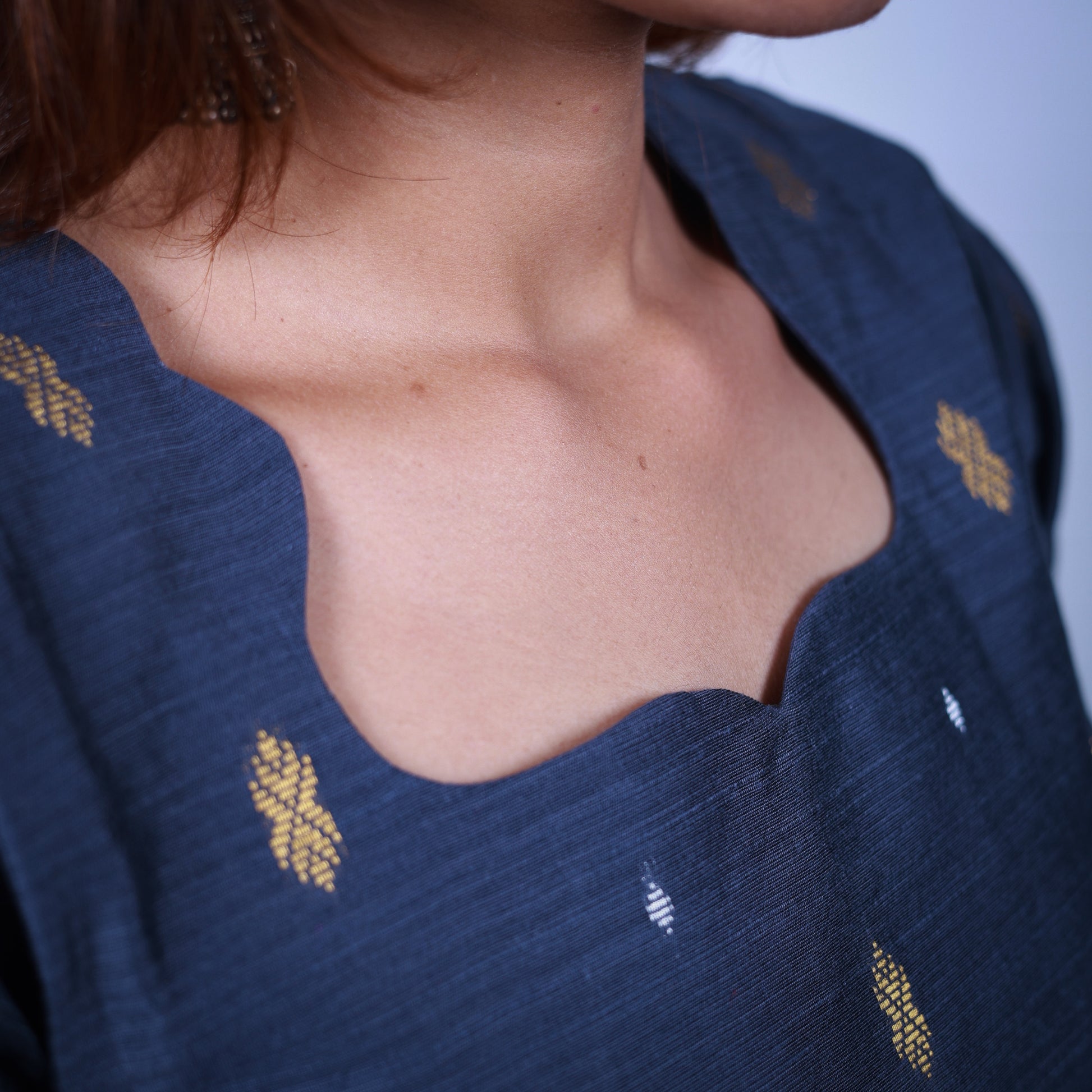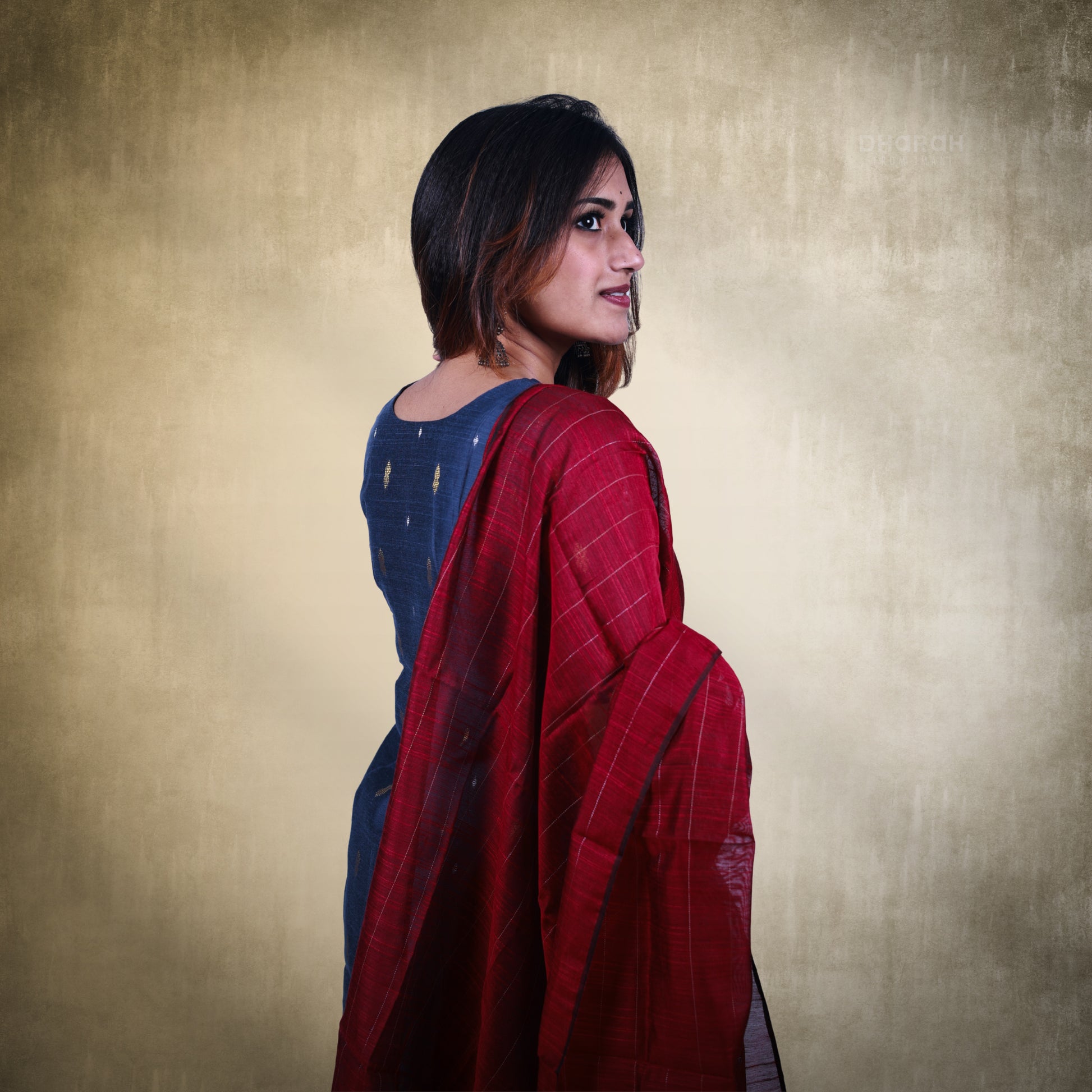 This gray raw silk kurti showcases classic zari butta detailing for a rich, sophisticated look. Finished with a finely woven border that enhances its timeless appeal.Designed for those who prefer understated elegance and classic styling. Carefully curated to offer you a refined and graceful ethnic ensemble.