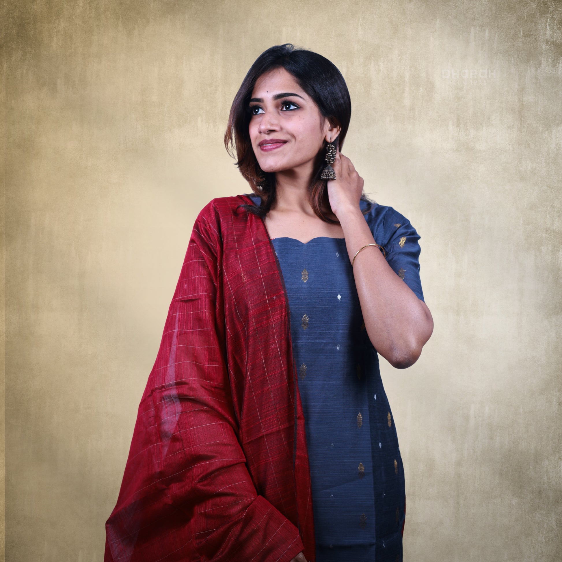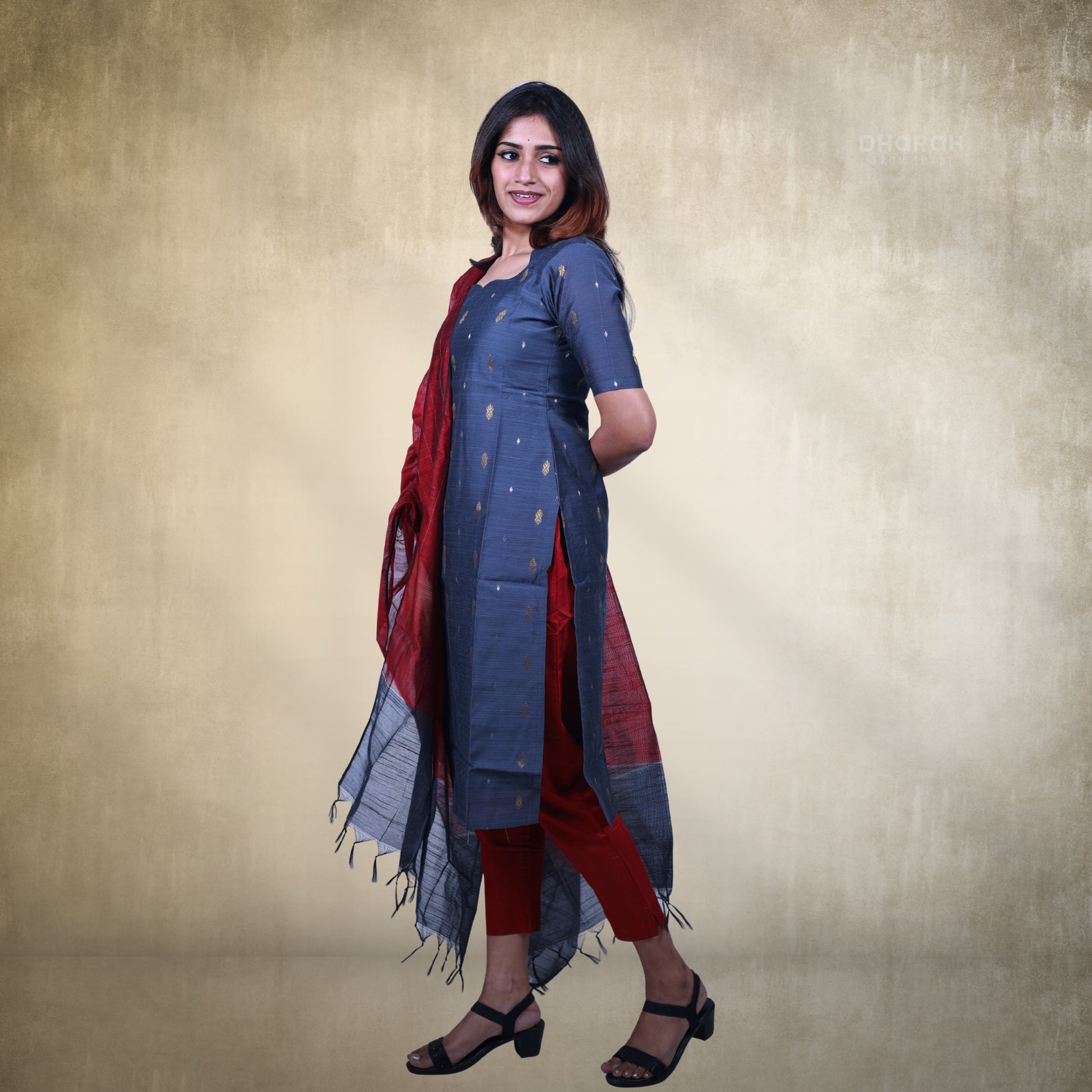 Classic Gray Raw Silk Zai Butta 3-Piece Kurti Set