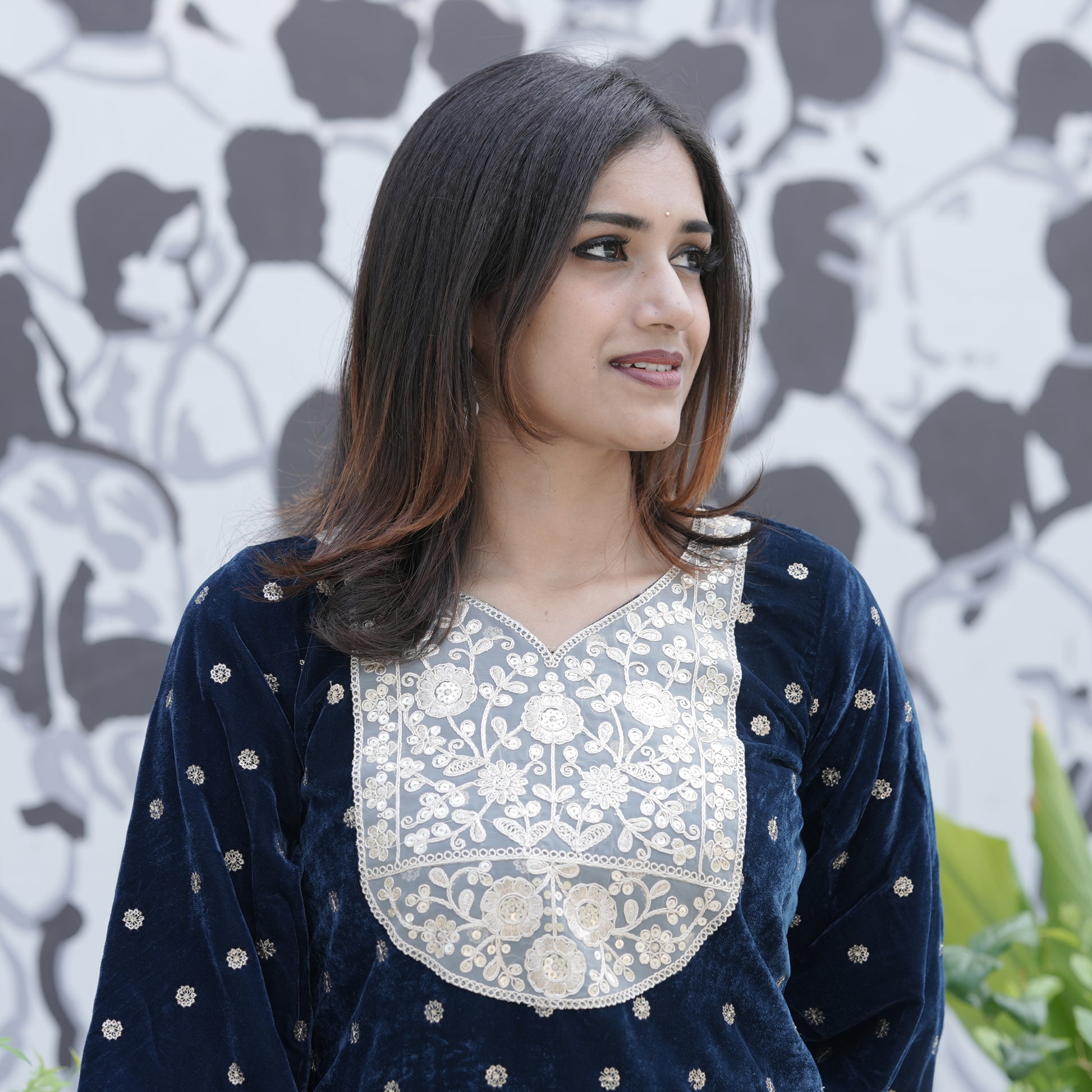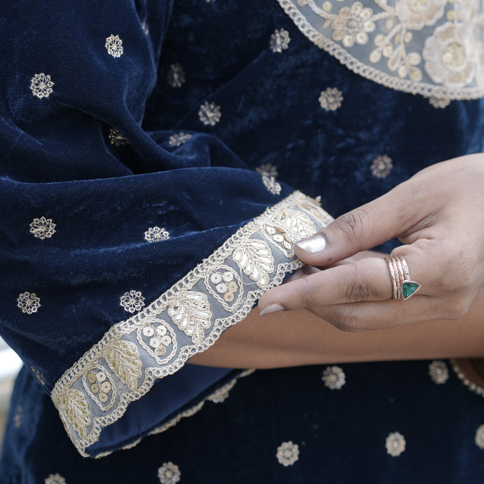 Dark Teal Blue Velvet 3-Piece Kurti Set with Elegant Floral Embroidery