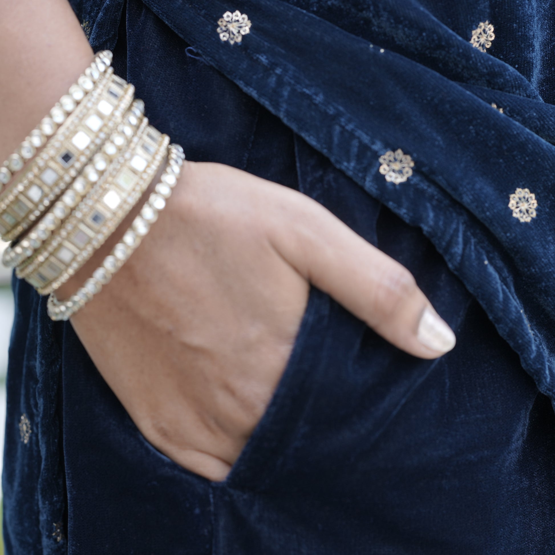 Premium velvet kurti set crafted with rich floral embroidery work and elegant bell sleeves. Enhanced with delicate lace detailing and refined neck patch work for a classy finish. Soft crepe lining ensures superior comfort and a graceful drape. Paired with a straight-cut velvet pant featuring crepe lining and an attached pocket. Finished with subtle bottom lace work, making it ideal for festive and special occasions.